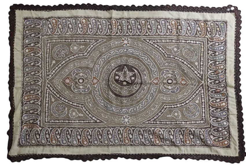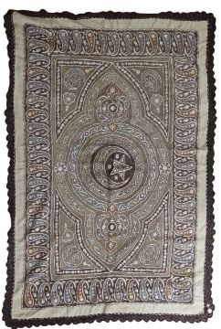19th century, worked in metallic thread the centre depicting the Islamic crescent moon and star, within Arabic script, to a border of repeating guls or teardrop motifs