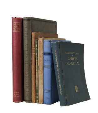 foreign and English, to include Katholischer, (1888), 8vo, quarter cloth backed on card with gilt tooled design to spine and cover, with Bullettino Di Archeologia Cristiana (1863) 8vo, cloth hardback, with County of London Plan (1943), 4to, cloth hardback, with Le Catacombe Romane, Anno XI E F, 8vo, cloth on bard, black design to spine, with Atlas Hierarchicus, (1913) 4to, card on board, pictorial printed front cover, with Namen Verzeichnis (1921), 8vo, hardback with gilt tooled design to front and spine, with Philips International Altas (1931) fo, hardback with gilt tooled design to cover and spine, most with respective book ownership plates to front end papers (7)