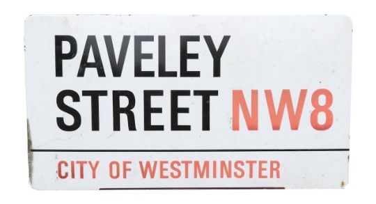 An enamelled iron street sign for Paveley Street NW8, City of Westminster