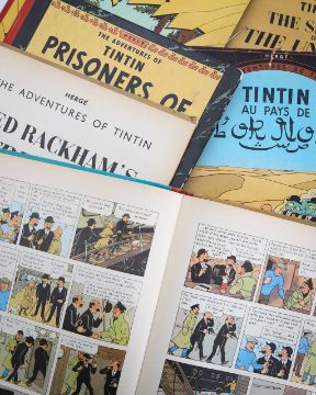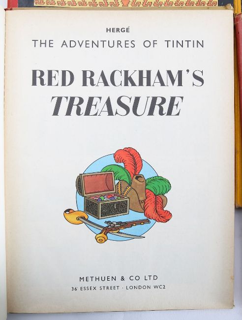 One first edition volume in original French Tintin Au Pays De L'or Noir (1950) together with Six English first editions, The Crab with the Golden Claws (1958), The Secret of the Unicorn (1959), Red Rackham's Treasure (1959),The Calculus Affair (1960), Tintin in Tibet (1962), Prisoners of the Sun (1962), 4to, cloth bound on pictorial card. (7)