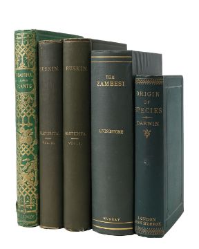 first edition, John Murray (1865), 8vo cloth hardback, gilt tooled lettering to spine, with folding out maps and plates throughout, together with Charles Darwin, Origin of the Species, Sixth edition, with additions and corrections, often thought to be the most complete version, John Murray (1894) 12mo, cloth hardback with blind stamp design to front cover and tooled gilt design to spine detailing author and title, together with E. J. Lowe, Beautiful Leaved Plants, first edition, Groomsbridge and Sons (1868) with sixty coloured illustrations (complete) blind stamp decoration to front cover with gilt tooled design work to spine and cover, together with Ruskin, Praeterita, Outlines of Scenes and thoughts, Volumes I, II, first editions, George Allen (1886, 1887) 8vo, cloth hardback with gilt lettering to spine. (5)