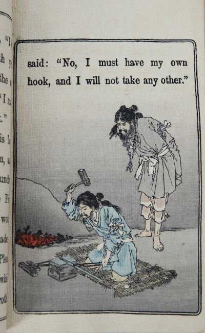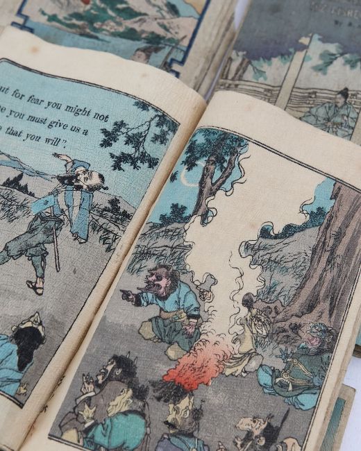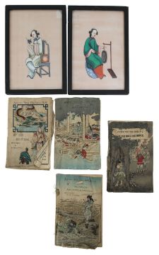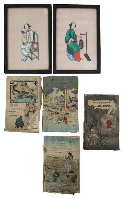 c. 1880, the Japanese books printed on crepe paper including 'The Old Man and the Devils', 'My Lord Bag-O-Rice', 'The Fisher Boy Urashima', and 'The Princes Fire-Flash & Fire-Fade', all translated in English, together with two Chinese watercolours, depicting seated ladies (6)
