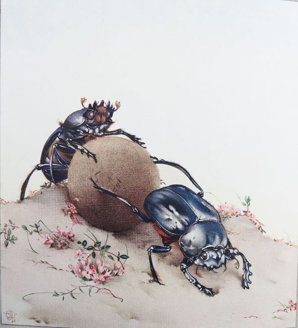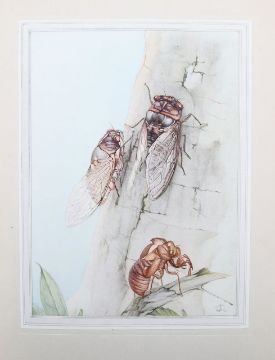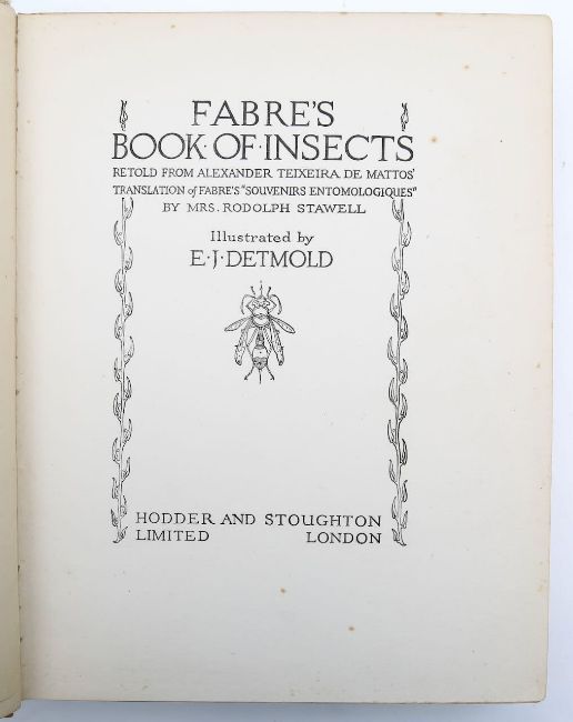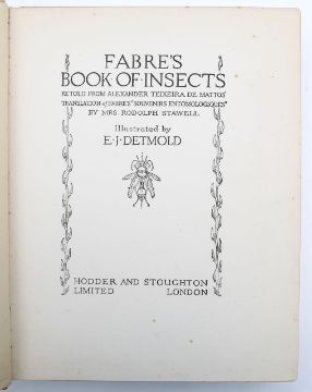 Fabres Book of Insects, illust E.J Detmold, published Hodder and Stoughton, no date, 4to illustrations throughout, collection of coloured plates throughout with captioned tissue guards, gilt decoration to front cover and spine, blind stamp to rear.