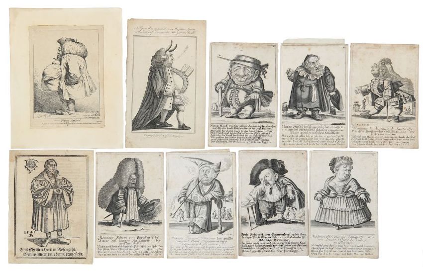 from Il Callotto resuscitato, oder, NeŸ eingerichtes Zwerchen Cabinet, or, Callot Resurrected, or the Newly Furnished Cabinet of Dwarfs, originally from a larger collection, to include plates by Joost van Sasse, P. van Buysen, Andries van Buysen the elder, et al, the plates labelled 18, 20, 21, 27, 47, 48, and 50, together with The Callotto appeared first in Amsterdam in 1716 in a multilingual edition printed by Wilhelm Engelbert Koning, with signed plates, and two satirical prints, printed for the Oxford Magazine 1775, 1768, AND LUTHER, Martin, a German Theologian 1548 (10)