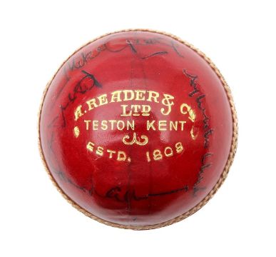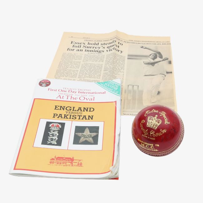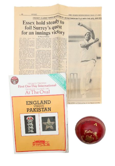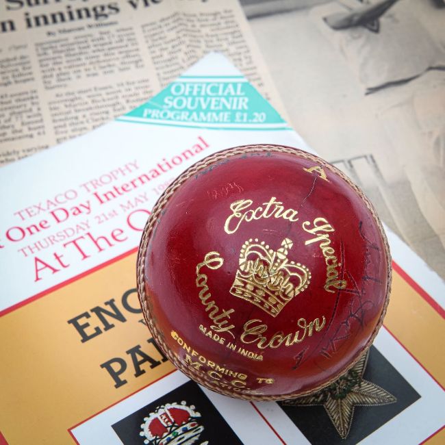 the red leather County Crown cricket ball signed by Mike Gatting, David Gower, Ian Botham, Mickey Stewart and Sylvester Clark, at the Texaco Trophy First One Day International at the Oval, England versus Pakistan, Thursday 21st May 1987, with a conforming programme (2)