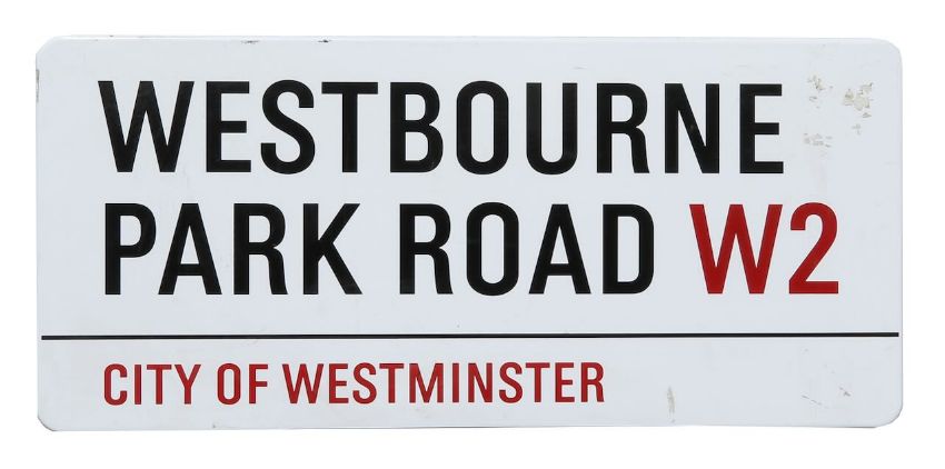An enamelled iron street sign for Westbourne Park Road W2, City of Westminster