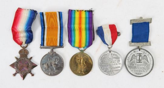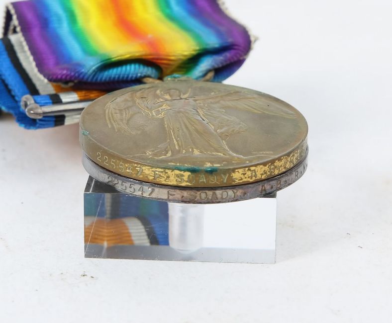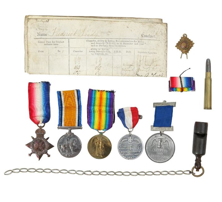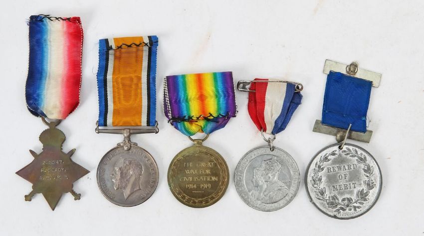 comprising a 1914-15 Star, a British War Medal, and Victory Medal, named to 225547 F. Soady, A.B.R.N, with the Certificate of the Service in the Royal Navy for Frederick Soady, including the names of ships sailed on, together with a bullet, WWI wood whistle, officer's shoulder pip, a George VI and Queen Elizabeth Coronation medal, and a Reward of Merit medal