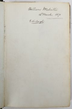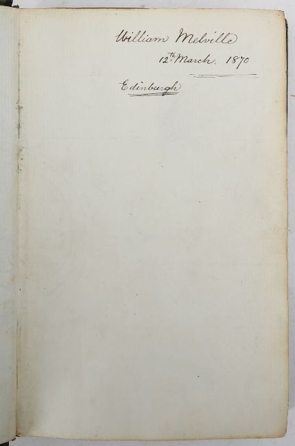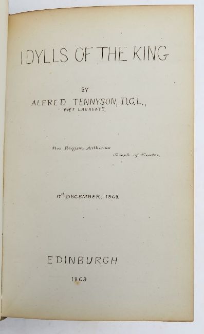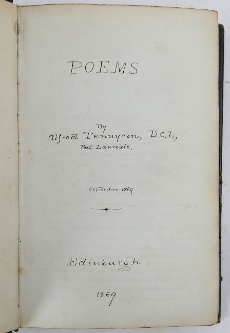 16mo, hardback, gilt tooled spine, end papers with blind stamp, inscription on front end paper titled; 'William Melville 12th March 1870, Edinburgh.' hand-written copy, detailing Tennyson's works from 1869-1870, with 5 works within;