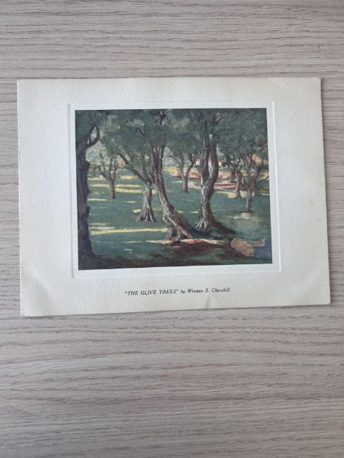 the photograph copyright Vivienne 20th Century Studios Limited, signed in ink on cardboard underneath, the printed Christmas card, depicting 'The Olive Trees' painting by Winston Churchill, the inside printed 'With Christmas Thoughts and Wishes from Winston and Clementine Churchill', together with a newspaper cutting titled 'From Sir Winston Churchill - in person', detailing the provenance; 'an autographed photograph of Sir Winston Churchill was personally presented by the statesman himself at Chartwell recently to a man who was the war-time Prime Minister's first uniformed police guard...' (2)