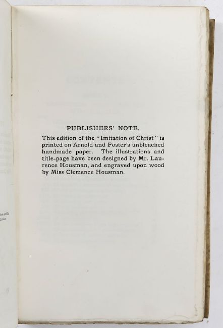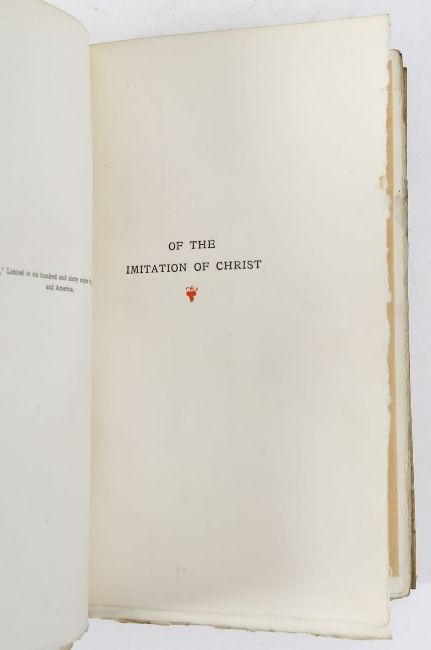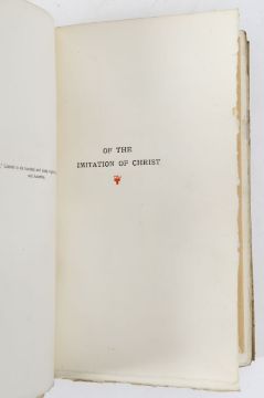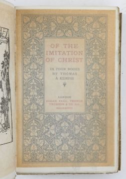 In four books by Thomas A Kempis, 8vo limited edition of 660 copies, published Kegan Paul, Trench Trubner & co (1898), printed on Arnold & Foster unbleached handmade paper, rough cut, with a pencil ownership name on the front end paper 'C Gunthorpe' vellum backed, with delicate gilt lettering to spine.