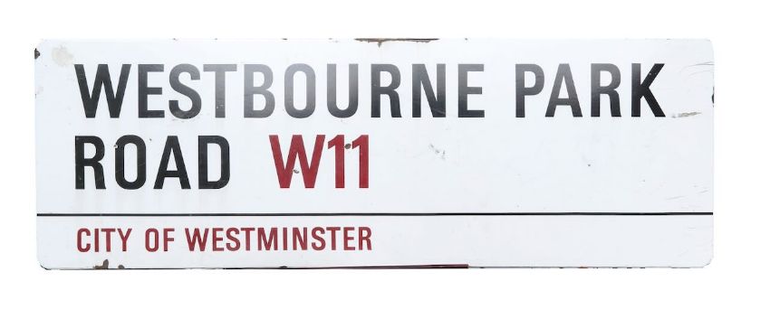 An enamelled iron street sign for Westbourne Park Road W11, City of Westminster