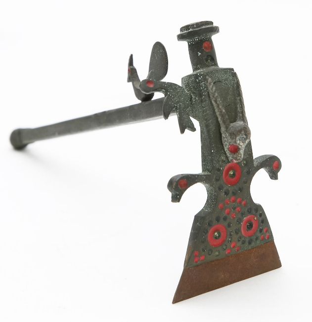 the ceremonial adze, possibly East African, surmounted by a straight-horned Oryx antelope and painted red, together with an African hardwood axe (2)