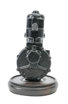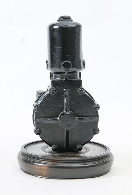 the cast metal miniature engine painted black, attached to a turned ebony plinth