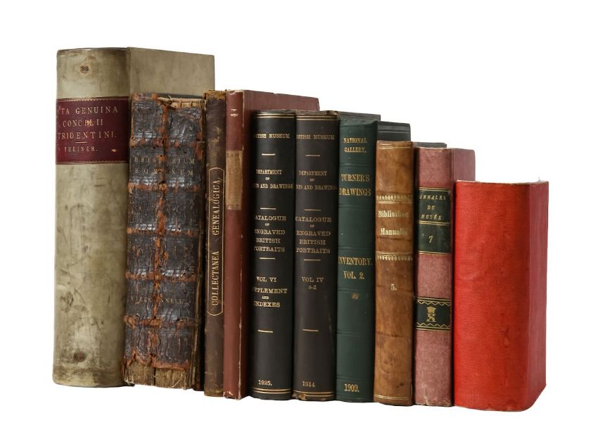 Ex Architypographia Plantiniana (1736) 8vo, full calf with blind stamp design to front cover, gilt tooled title to spine, and five raised bands, together with Acta Authentica... Concilii Tridentini... Tomus I, an ink inscription dating (1874) , 8vo, vellum bound with calf title to spine, ownership bookplate on front pastedown, together with others, Collevtanea Genealogica, Ferrerii Historia Abbatum de Kynlos, Bibliothee Manualis, Annales Du Musee, Walks in Rome, Volume II, two reference books from The British Museum, and another similar from The National Gallery. (10)