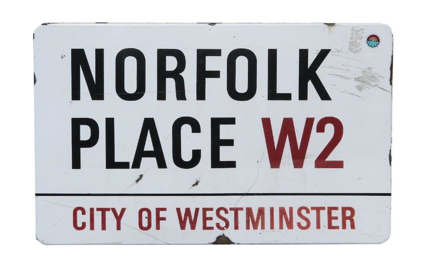 An enamelled iron street sign for Norfolk Place W2, City of Westminster