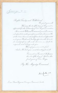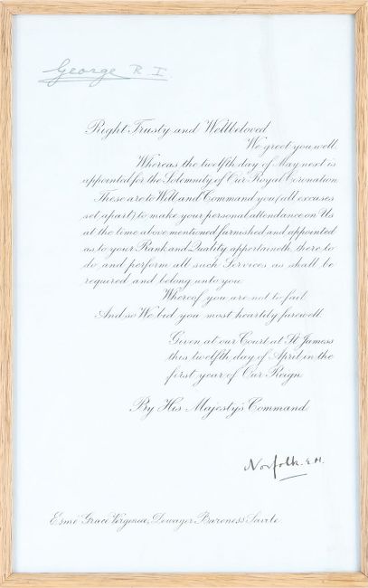 addressed to EsmŽ Grace Virginia, Dowager Baroness Savile, 'Right Trusty and Wellbeloved, We greet you well. Whereas the twelfth day of May is appointed for the Solemnity of Our Royal Coronation. These are to Will and Command you all (excuses set apart) to make your personal attendance on Us at the time above mentioned, furnished and appointed as to your Rank and Quality appertaineth, there to do and perform all such Services as shall be required and belong unto you... By His Majesty's Command', signed in ink by George VI 'George R.I', and the 16th Duke of Norfolk 'Norfolk E.H',