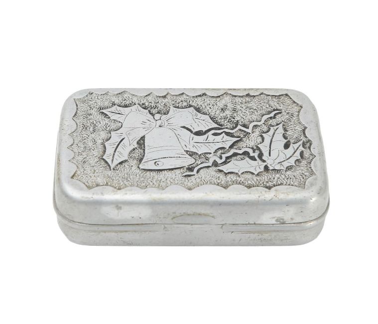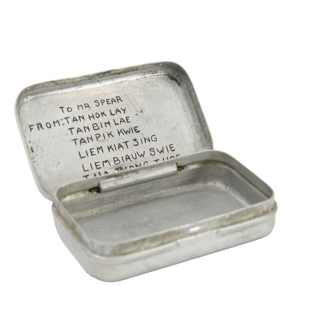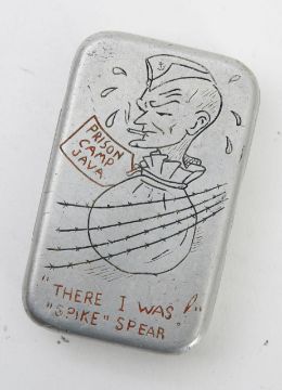 from a Japanese-run prison camp in Java, the underside depicting a cartoon Naval soldier smoking a cigarette in a bag with barbed wire, inscribed 'Prison Camp Java, 'There I Was! "Spike" Spear', the lid depicting Christmas bells and holly, opening to reveal interior inscriptions 'TO MR SPEAR, FROM: TAN HOK LAY, TAN BIN LAE, TAN PIK KWIE, LIEM KIAT SING, LIEM BIAUW SWIE, TJIA TJONG TJIOE'