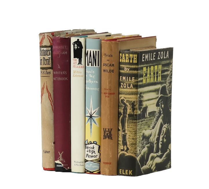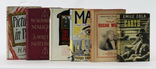 to include first editions of : A Writers Notebook by W Somerset Maugham, Heinemann, The Art Stealers by Milton Esterow, Weidenfeld & Nicolson, , Earth by Emile Zola, Elek, in addition, Mani Travels in the Southern Peloponnese, John Murray sixth edition, The Trials of Oscar Wilde, William Hodge and Company, 1952 fourth edition, original pictorial paper dust jackets. (6)