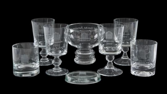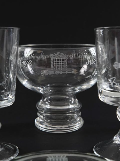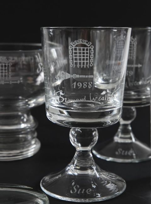 Betty Boothroyd; two acid etched wine goblets and a tumbler, dated 1992, 1993, and 1998, and Bernard Weatherhill; two acid etched wine goblets, a pedestal dish, and a paperweight dated 1992, 1988 and 1989, and another House of Commons tumbler (8)
