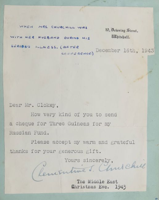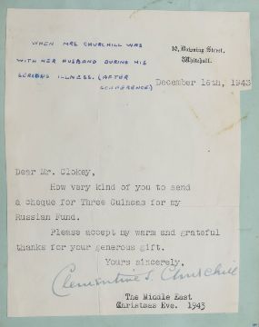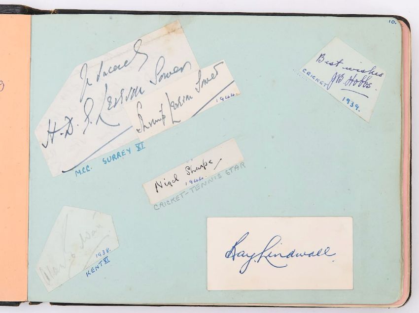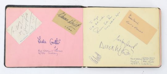 1940s - 1990s, including ink signatures, many glued and taped in, on cut out pieces of paper, from Clementine Churchill, signed on a letter of thanks for donating to the WWII Red Cross Aid to Russian Fund Campaign, Anthony Hopkins, actor and comedian George Graves, English cricketer Jack Hobbs aka 'The Master', American actress and signer Edith Day, the BBC Theatre Orchestra and many others