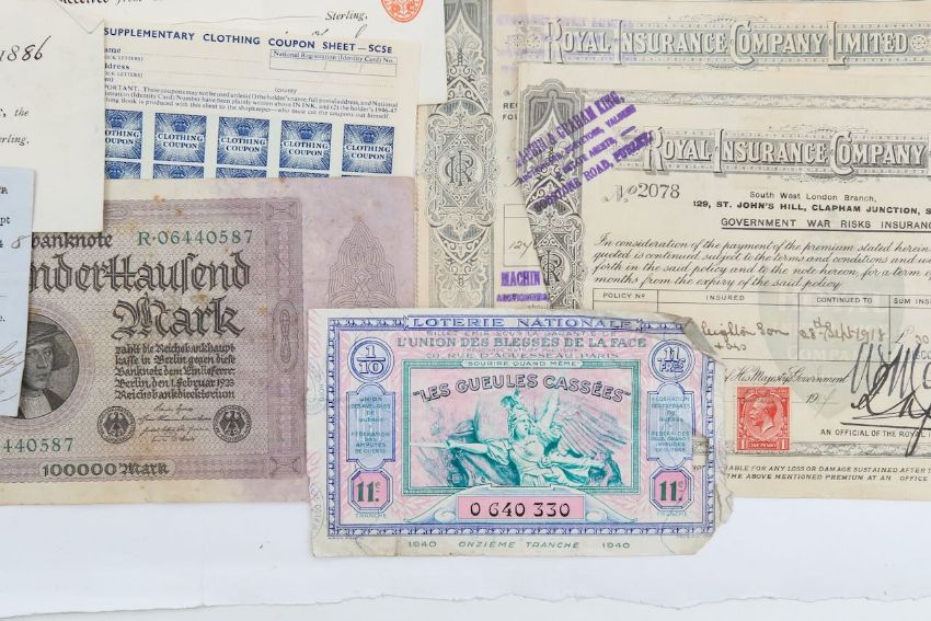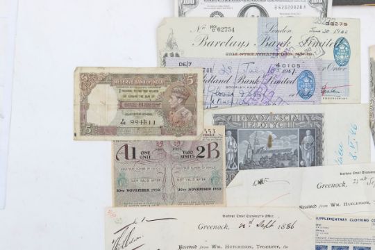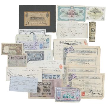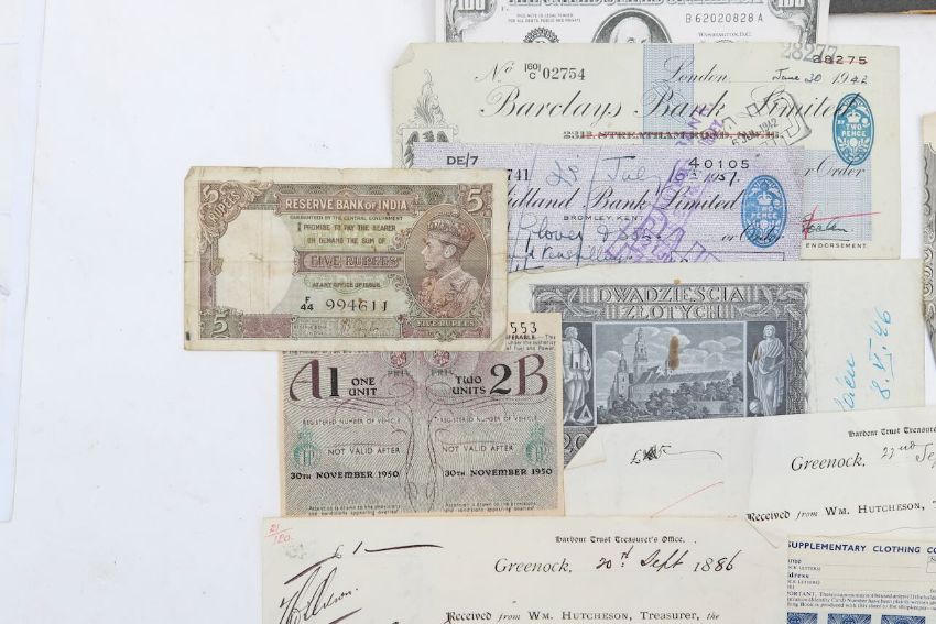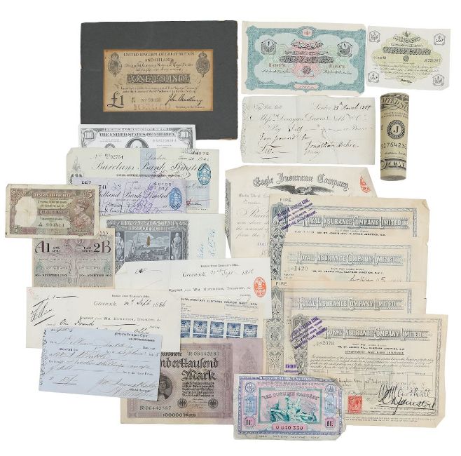 the first treasury note (Bradbury of the second series produced around October 1914), together with insurance slips dating 1915-1919, notably 'Government War Risks Insurance' note on 1917 insurance slip, and various notes to include King George VI Reserve of India 5 rupees bank note, motor fuel ration coupons, and a French national lottery ticket, 1940, to raise money for 'Les Gueules Cassees' or 'The Broken Faces' to support disfigured WWI veterans