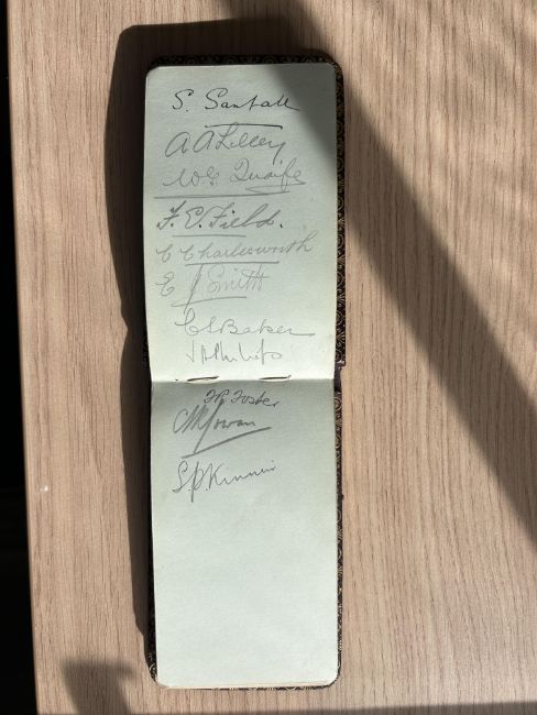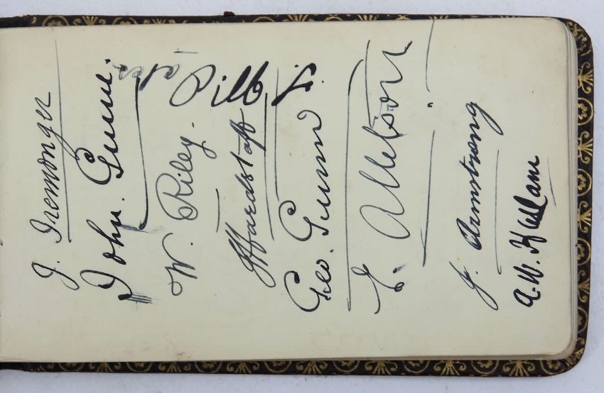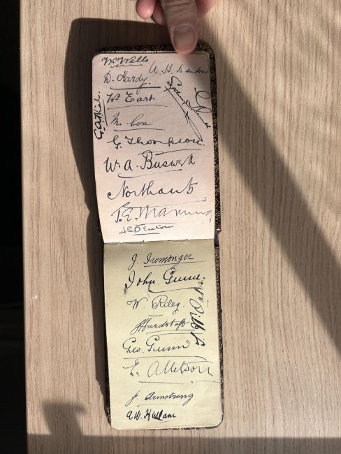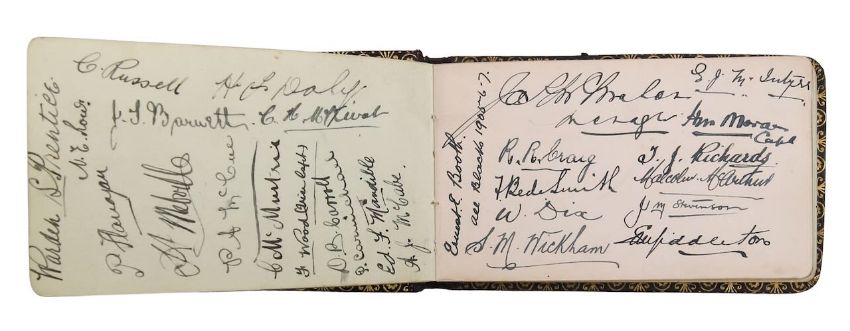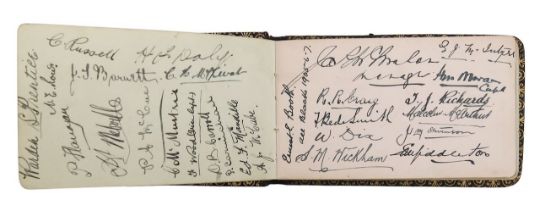 to include 26 signatures from the Australia rugby team, nicknamed' The Wallabies' which won the Gold medal at the London Olympic games 1908, defeating Cornwall in the final at the White City Stadium 32-3 October 26th. Also included, Earnest Booth New Zealand All Blacks 'The Originals' 1908, 11 Northamptonshire cricket c1908/09, 9 Nottinghamshire cricket c1908/09, 11 Warwickshire cricket c1908/09 and Australian cricketer Frank Laver. Mainly in black ink, Warwickshire mostly in pencil.