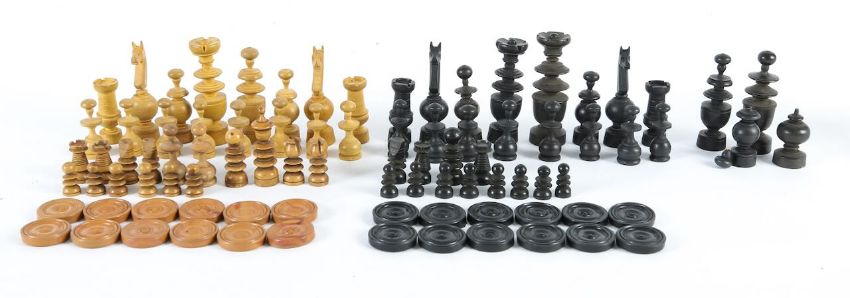 late 19th century/early 20th, each turned piece with baize to base with a single piece wooden chess board, together with another complete turned wooden chess set, and another incomplete with draughts, and one other