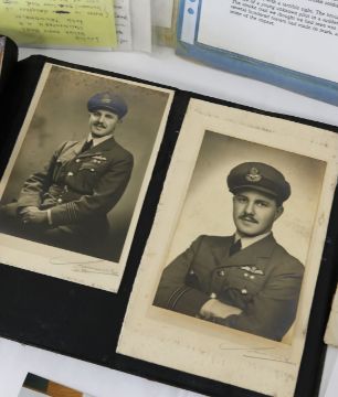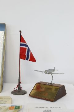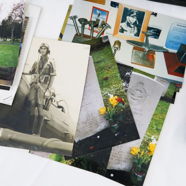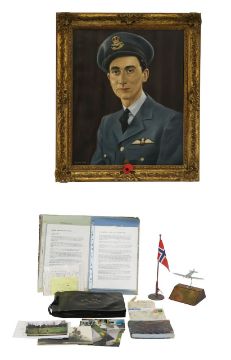 The collection includes a model Spitfire made from the recovered fuselage of Gimson's Spitfire, an oil on canvas portrait of Gimson, signed 'N.K Sale', dated 1944, letters written by Gimson, including an example dated 7th April (the last one sent before his death) from the Officer's Mess at Wick, detailing that 'life is quite good at present', another dated 6th February 1941, sent from the Offier's Mess at Catfoss, explaining 'It's the way we have all chosen, and through many of us will no doubt come through the war sale and sound, many of us will not be so lucky', his epaulettes, an album including photographs of Gimson, his RAF training crew in front of a North American Harvard IIV, Christmas cards sent from Rhodesia, 'Reported Missing' newspaper clippings, and further newspaper articles and photographs of other WWII RAF pilots, together with a scrapbook complied by Gimson's sister Jacqueline about her visit to Norway in 1992, for a memorial service to commemorate the discovery of the engine and 50-years since the crash, including photographs of the grave, and Norwegian newspaper articles (qty.)