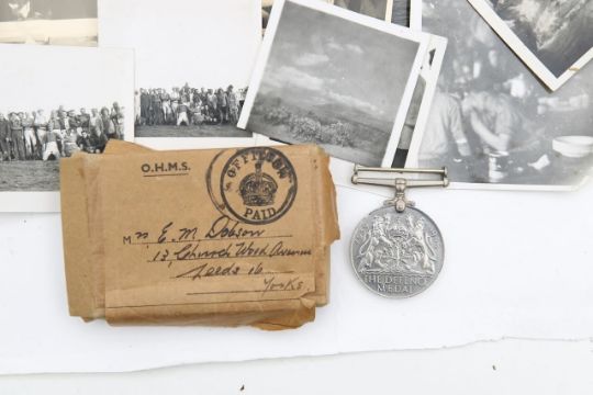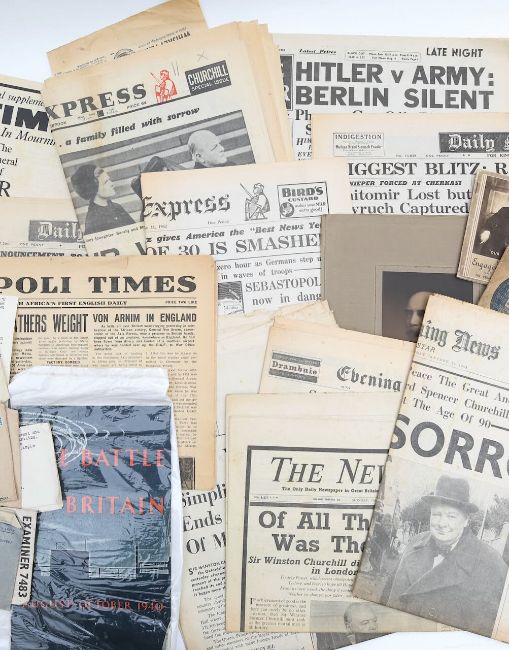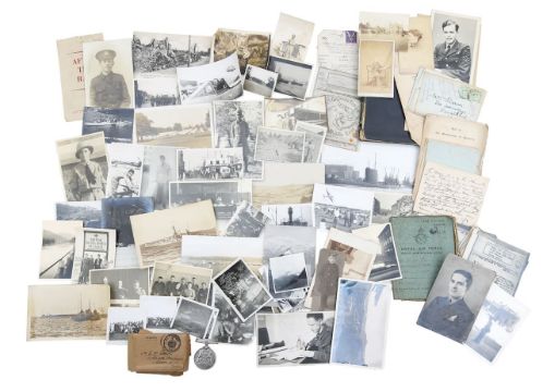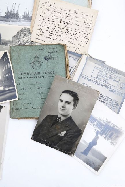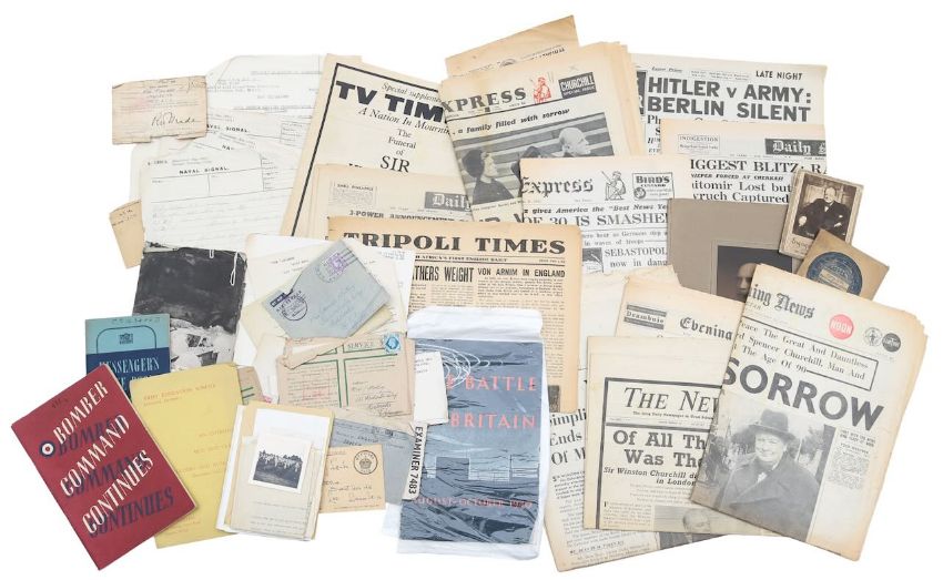 comprising photographs of soldiers, training camps, and a derailed train, a Royal Air Force Service and Release Book, for Flight Sergeant A.R Lloyd, no. 1385384, a Wandsworth Borough Council Air Raid Precaution latter, The Daily Mail Victory Edition 'VE-Day - It's All Over', and other WWII newspaper articles, The Evening News 'Day of Sorrow', announcing the death of Winston Churchill and a TV Times Special Supplement (qty.)