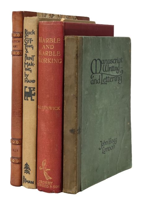 Margaret Dobson Block Cutting and Print Making By Hand, first edition, Sir Isaac Pitman & Sons, 8vo, pictoral cloth boards in black and red, 21 advertisement plates to end papers, together with W. G. Renwick, Marble and Marble Working, signed first edition, Crosby Lockwood and Son (1909), 8vo, gilt tooled title to front cover and spine, hardback, 22 advertisement plates to end papers, and, John Hogg, Manuscript Writing and Lettering, first edition, John Hogg (1918), 8vo, cloth backed card, 10 advertisement plates to end papers,