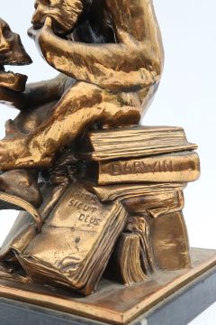 modelled after Rodin's 'The Thinker', holding a compass with its toes, and pondering a human skull, whilst sat on a pile of books titled 'Darwin', inscribed 'Eritis Sicut Deus', raised on a black veined marble base, unsigned