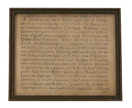 a printed notice for Belsize Park, detailing upgrades to the park, promoting music, and protection against 'Highwaymen or footpads which may infest the road', framed and glazed