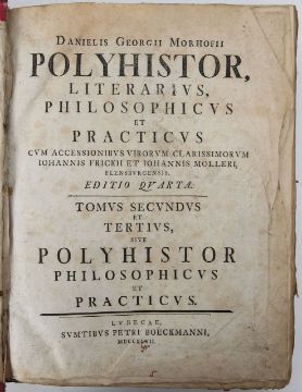 Prosperi card de lambertinis... Domini Nostri Jesu Christi Romae (1751) 8vo, vellum bound with paper title to spine and ex library ink stamp, front pastedown with two respective ownership book plates, and an additional library ink stamp, title with red and black ink, together with Sanctissimi Domini Nostri Benedicti Papae XIV... Tomus Primus and Tomus Secundus (1767), 8vo, vellum bound, tomus primus with ink title to spine, (Tomus Secundus lacking), ex library ownership plates to the front paste down and some library ink stamps throughout 'The Library Bexhill', etc., together with Polyhistor, Literativs Philosophicvs et Practicvs, Editio Quarta, Tomus Secundus et Tertius (1747) 8vo, vellum dust jacket with card cover underneath, with paper title to spine, five raised bands (4)