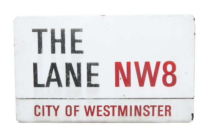 An enamelled iron street sign for The Lane NW8, City of Westminster