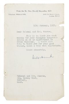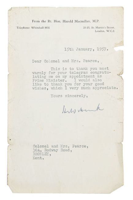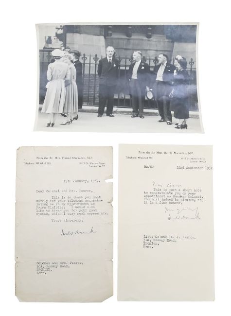 all addressed to Colonel Ken Pearce, comprising a letter signed in ink, headed 'From the Rt. Hon. Harold Macmillan, M.P, 10-15 Martin's Street, London W.C.2', dated 15th January 1957, inscribed 'This is to thank you most warmly for your telegram congratulating me on m,y appointment as Prime Minister, I would also like to thank you for your wood wishes, which I was very much appreciate', another letter from Macmillan, signed in ink, dated 22nd September 1952, inscribed 'This is a short note to congratulate you on your appointment as Honorary Colonel. You must indeed be pleased, for it is a fine honour', and a photograph of Colonel Pearce and Harold Macmillan, standing together at a friend's wedding (3)