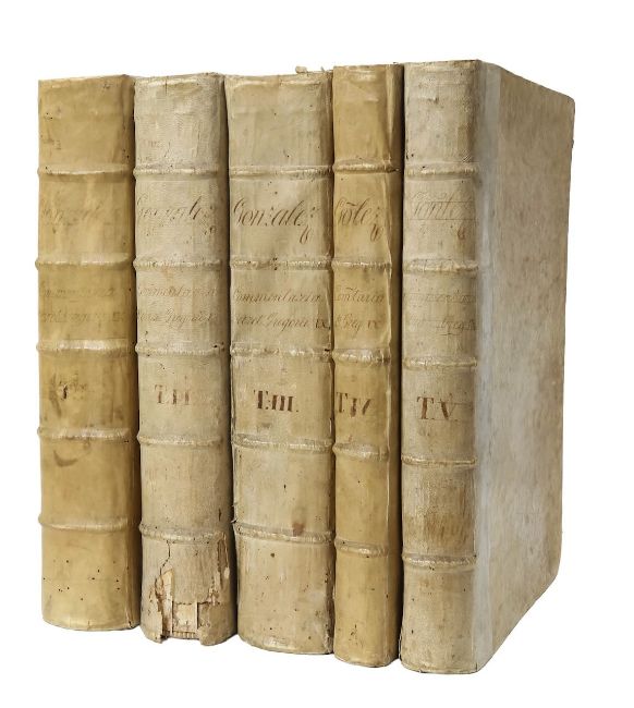 Commentatia Perpetua... first edition: Tomus Primus (1693), Tomus Secundus (1693), Tomus Tertius (1693), Tomus Quartus (1693), Tomus Quintus (1693), 4to, vellum bound with pen title and volume inscriptions to spine, with five raised bands, title pages with red and black text, this is a run of Canonical commentary, and a nice vellum run. (5)