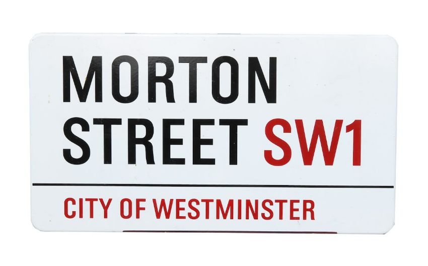 An enamelled iron street sign for Morton Street SW1, City of Westminster