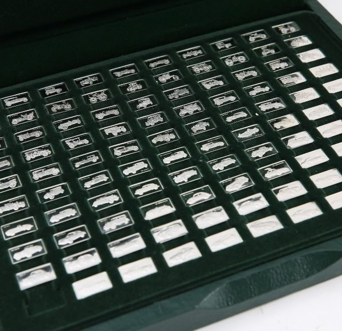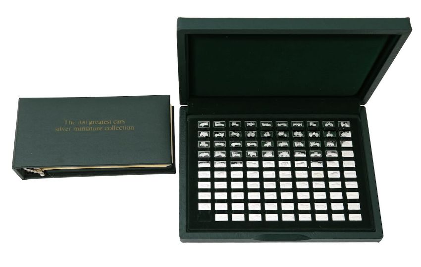 A Pinches cased silver '100 Greatest Cars' ingot set,