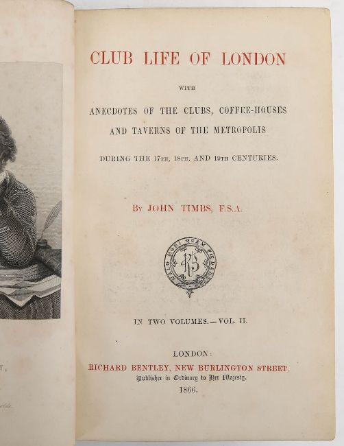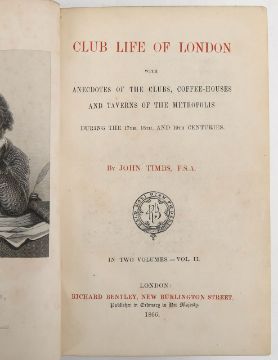 TIMBS, John, Club Life of London, with anecdotes of the clubs, coffee-houses, and taverns of the metropolis during the 17th, 18th, and 19th centuries.