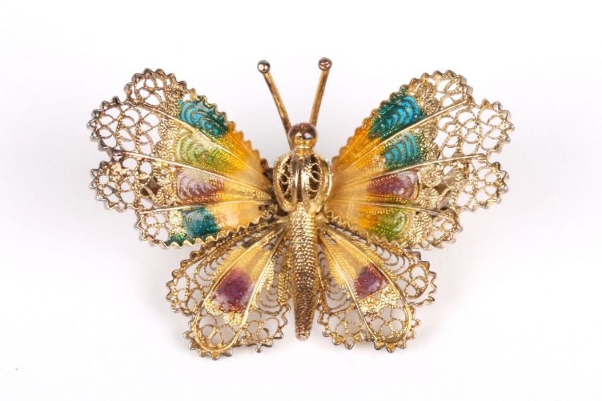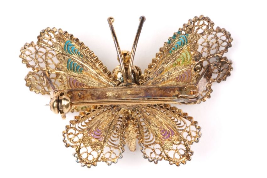 A silver gilt and enamel filigree butterfly brooch, the wings decorated with brightly coloured enamels, stamped .800. 4.5cm wide . Good condition.