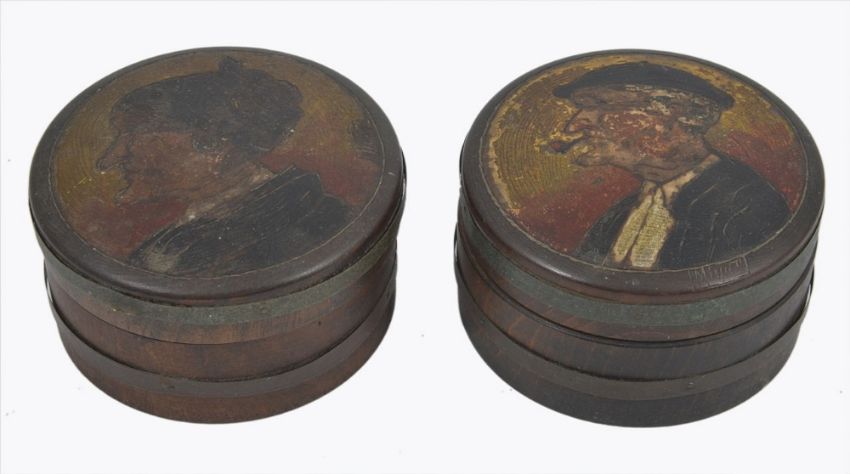 Two lacquer wooden boxes, late 19th century the screw top boxes of circular form, one lid depicting a lady in stained woods the other a gentleman, diameter 10.5cm . With some wear and in fair condition