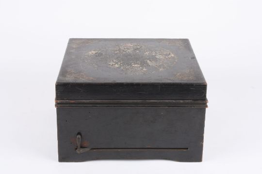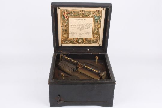 A Symphonion disc musical box, German, circa 1900 the 9 ½-inch metal discs playing on two combs, contained within lacquered case with transfer design to the lid, together with eleven metal discs, width 29cm . The outer case in poor condition. The case with general scratches and wear, and the majority of the transfer is missing and damage. the interior of the case is in better condition, and the two combs look to be in fair condition with no major damage.
