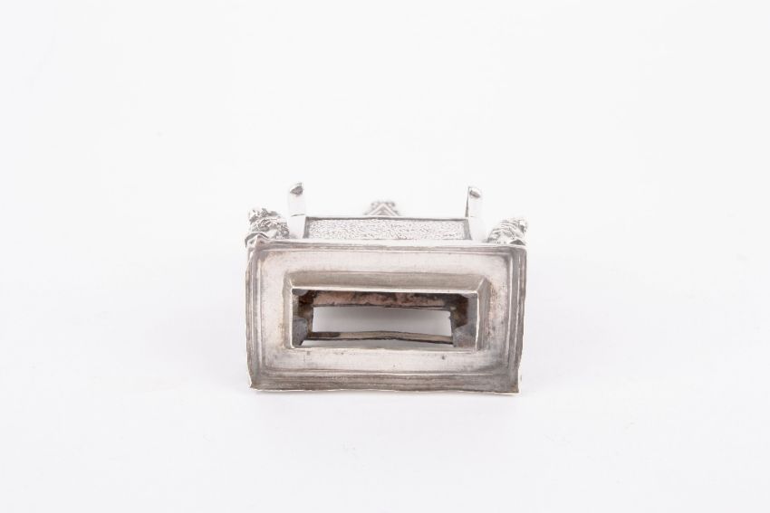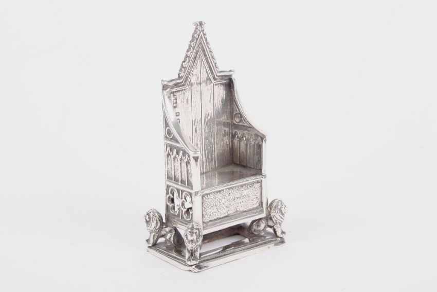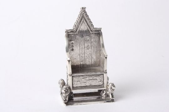 A novelty miniature silver Edwardian Coronation throne, hallmarked Birmingham 1901, with makers initials for Levi and Salaman, the gothic throne mounted on four lion feet, missing pin cushion, height 7cm . Originally a pin cushion - missing cushion, clearly marked. in good overall condition