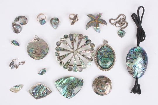 A collection of abalone costume jewellery, including several pendants one with a mounted sailing ship, a buckle, clip on earrings, cufflinks, rings and two brooches, the buckle 8.5cm . Various conditions, one of the rings missing some of the shell, but generally all in good condition.