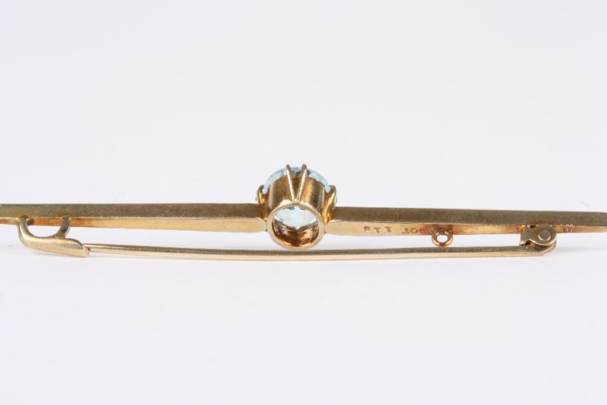 A 9ct gold and aquamarine bar brooch, with an oval claw-set aquamarine on a tapering bar, stamped 9ct. 4.7 grams. 6.5cm long . Good condition.