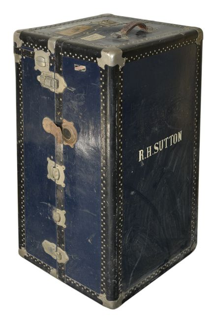 A navy blue travelling trunk, with drawers and compartments, width 54cm . Worn, with painted name
