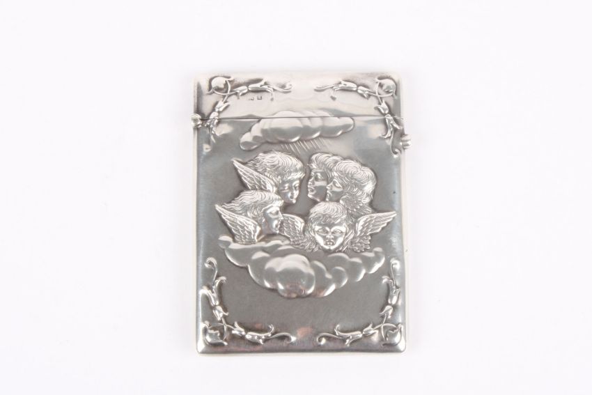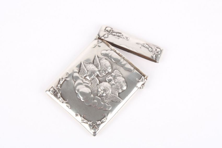 A Victorian silver card case, hallmarked Birmingham 1900 with makers initials probably for Henry Matthews, embossed with putti amongst clouds with stylised flower sprays to the corner, 2.4ozt, length 10cm . Good snap shut, the hallmarke on the top of the case, but the mark on the inside is good and clear. The case overall is in good clean condition with no obvus marks or scratches.