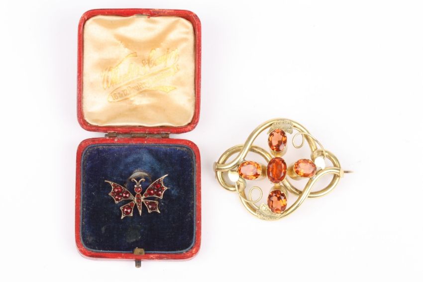 A Victorian garnet butterfly brooch, together with a large pinchbeck knotted brooch -2 . Fairly good condition, some wear in places.