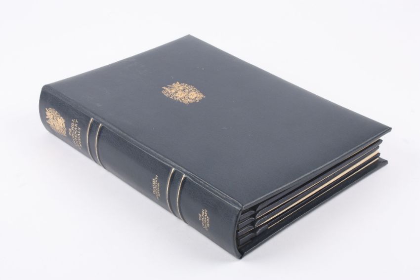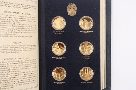 The Churchill Centenary Medals, A Limited edition bound set of 24 silver gilt medals, minted by John Pinches Ltd, number 1470, with certificate in blue bound album . Generally good condition.
