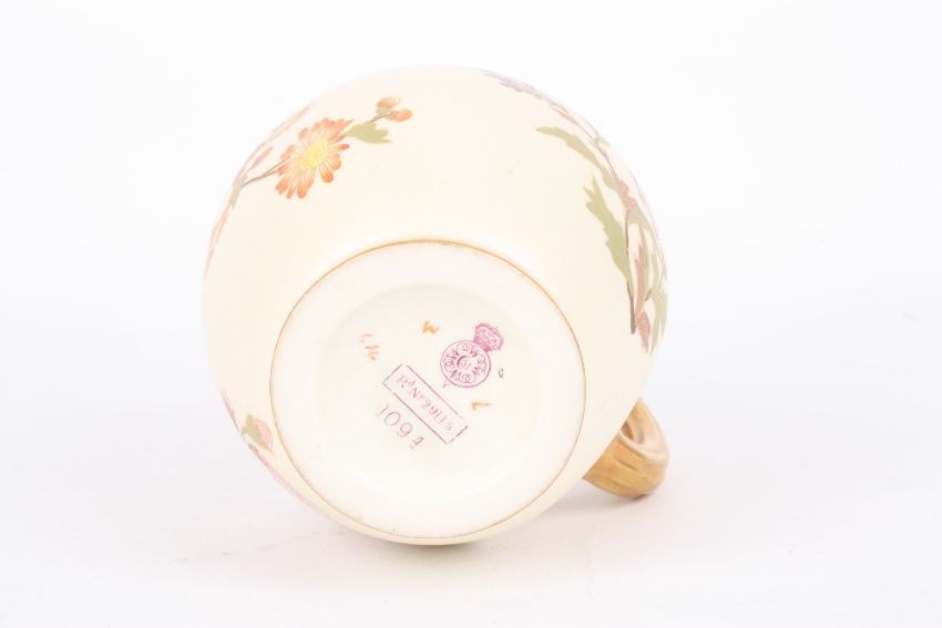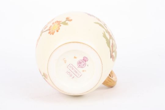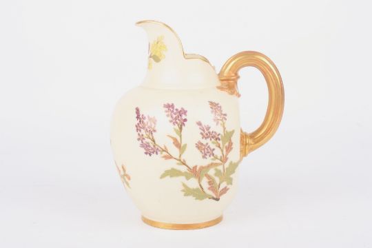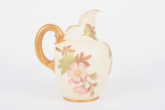 A Royal Worcester blush ivory jug, painted with sprays of flowers and with gilt handle. Mark in puce to base and dated 1887 16cm high . Good condition.